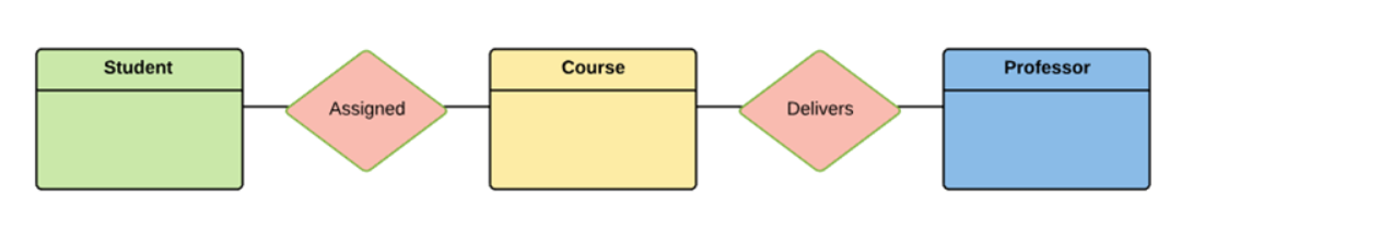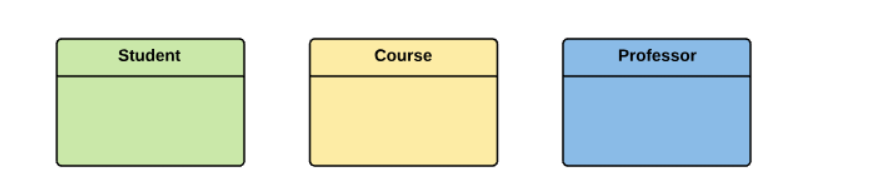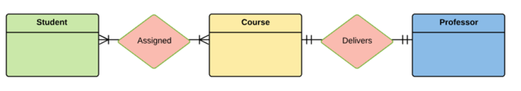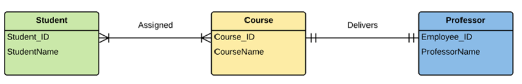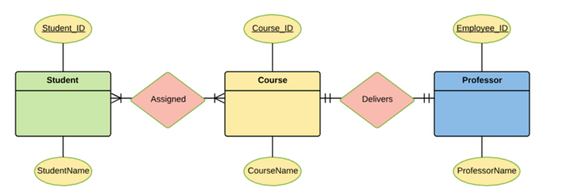 In a university, a Student enrolls in Courses. A student must be assigned to at least one or more Courses. Each course is taught by a single Professor. To maintain instruction quality, a Professor can deliver only one courseStep 1(Identification of Entities)